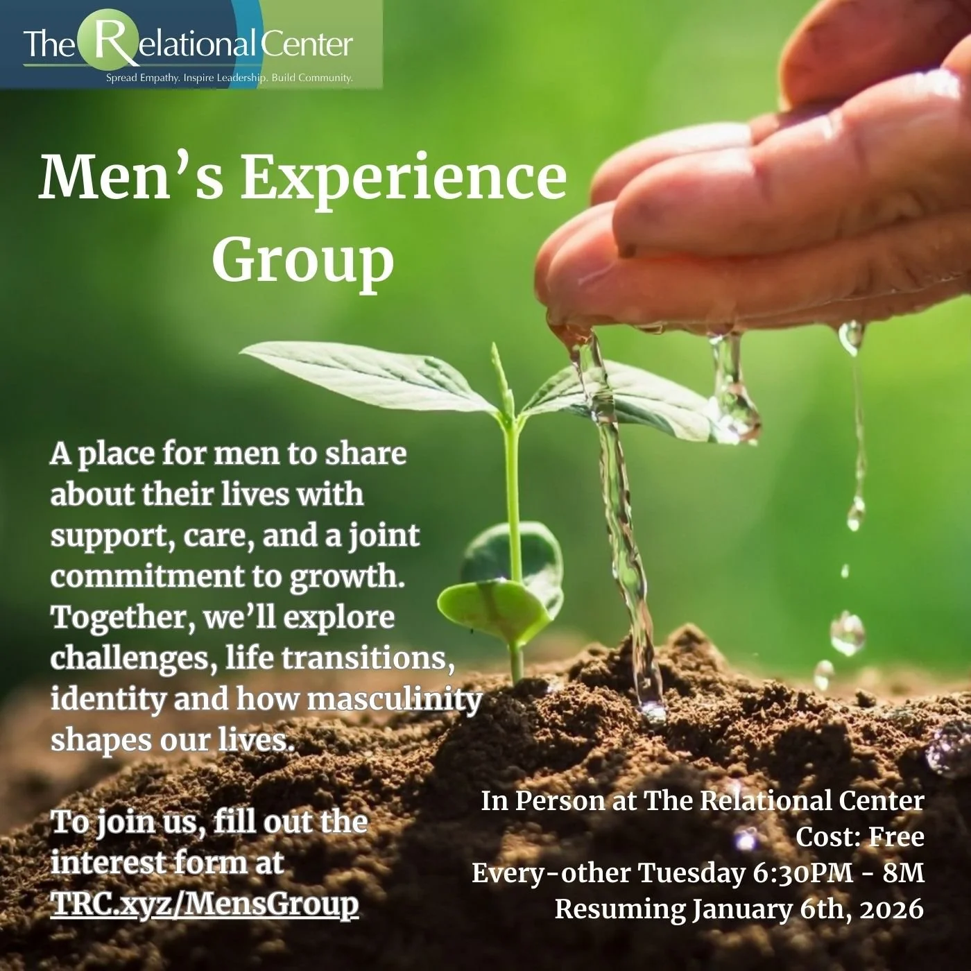 If it’s your first time joining us, please fill out our interest form so we can welcome you to the group and answer any of your questions. For any other questions, please reach out to us at mensgroup@relationalcenter.org.